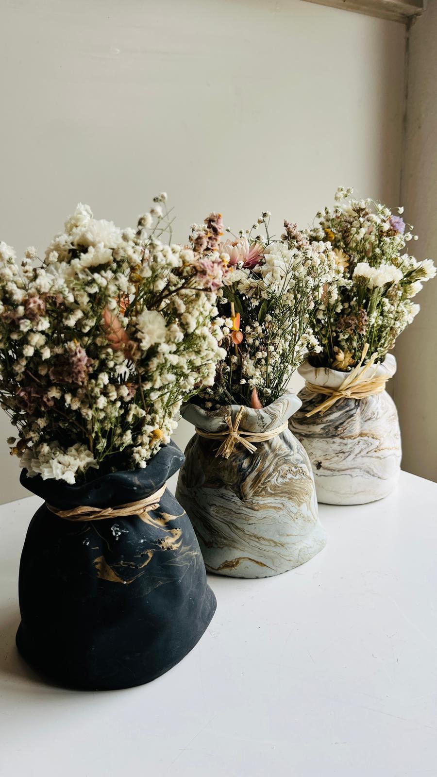 אגרטל בטון בעבודת יד עם מראה רך וזורם שמזכיר בד קשור.