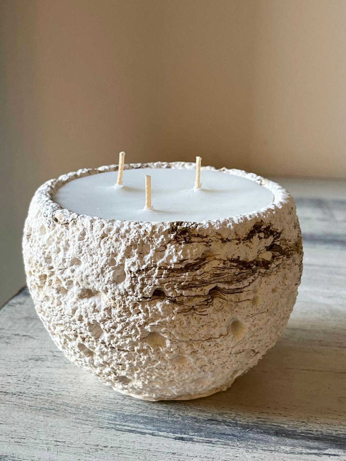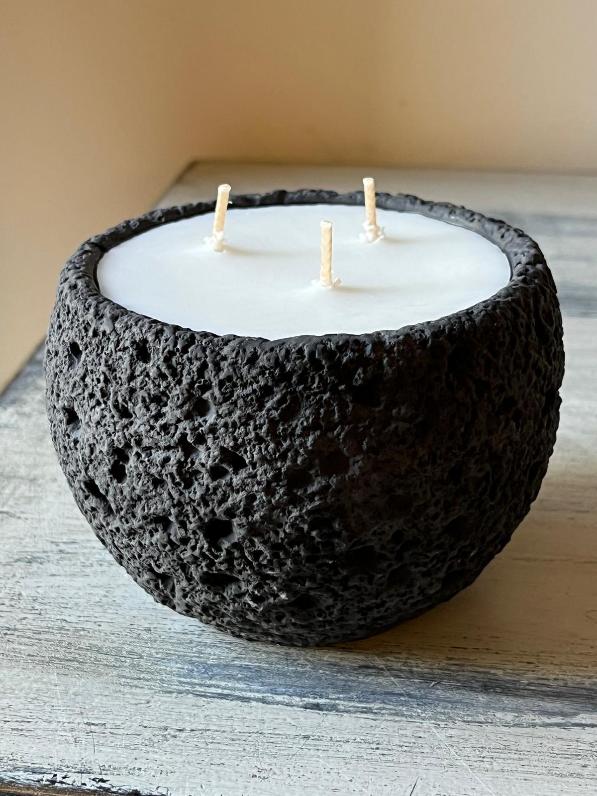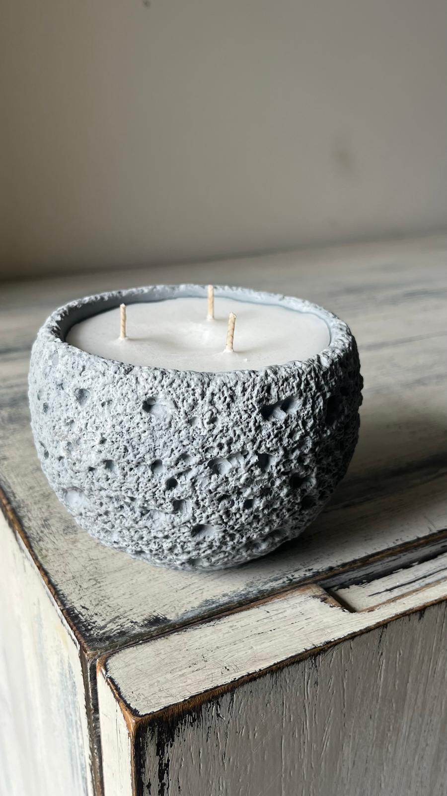 נר MoonRock שואב השראה מהמרקמים של סלעים וולקניים וקליפות ירח.